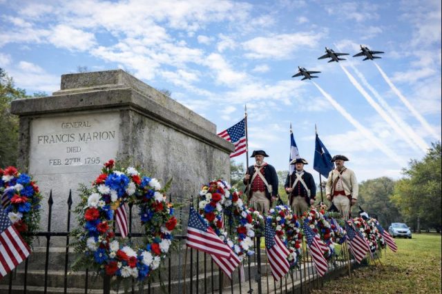 The ceremony will begin at 11 a.m. and will include a South Carolina Air National Guard flyover, organizers announced. The event is sponsored by Gen. Marion’s Brigade, the Daughters of the American Revolution (DAR) and the Sons of the American Revolution (SAR), with participation from the 169th Fighter Wing (SCANG) and the Washington Light Infantry. The National Anthem will be performed by Miriah Wright.
